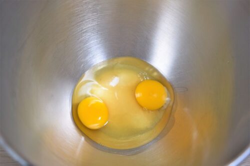 - Zucker und Eier in eine Rührschüssel geben und mit einem Handrührgerät oder einer Küchenmaschine schaumig aufschlagen.2 Eier, 100 g Rohrohrzucker
