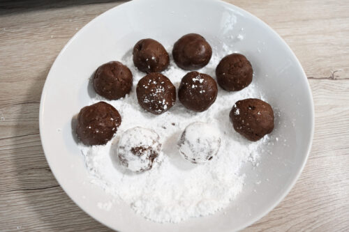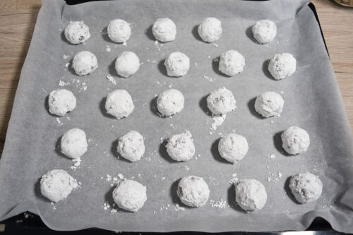 - Den Teig aus dem Kühlschrank nehmen und aus diesem kleine Kugeln formen, als Anhaltswert für die Größe nehmen ich eine Walnuss.