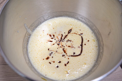 - Milch und Vanilleextrakt zur Ei-Zucker-Mischung geben und unterheben. Die Kuvertüre-Butter-Mischung zugeben und vermischen.100 ml Milch, 2 TL Vanilleextrakt