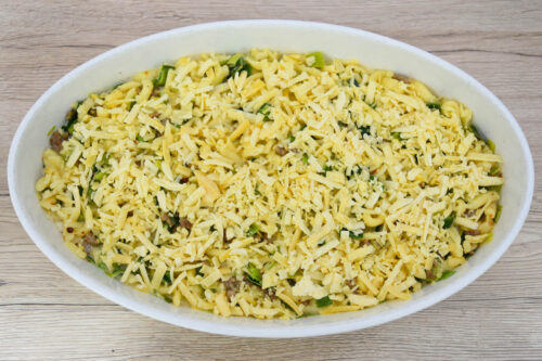 - Nach Ablauf der Zeit den goldbraunen Auflauf aus dem Ofen nehmen, anrichten und servieren.