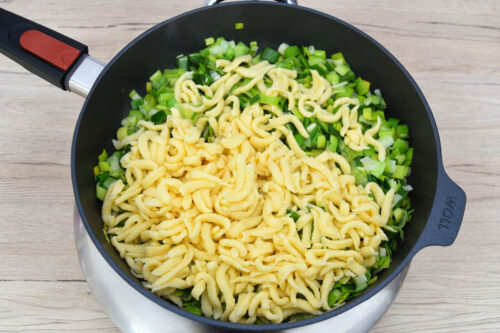 - In die gleiche Pfanne den Lauch anbraten, eventuell etwas Öl zugeben. So lange braten bis der Porree weich ist. Die Spätzle zugeben und mit dem Lauch gut vermischen und noch etwas braten lassen.400 g Spätzle, 2 EL Öl zum Anbraten, 450 g Porree