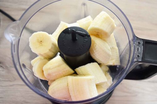- Die Bananen schälen, in kleine Stücke schneiden und mit dem Zitronensaft in einen Zerkleinerer geben und zu einem feinen Püree mixen.