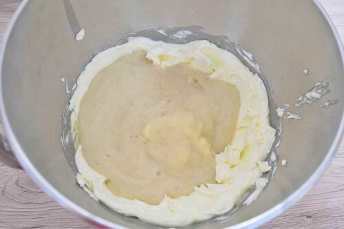 - Das Bananenpüree zu der Mascarpone Masse geben und unterziehen.