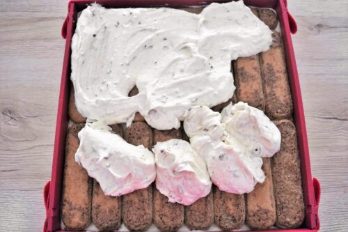 - Den getränkten Biskuit mit der Zuckerseite nach unten in die Form legen und dann den zweiten Löffelbiskuit in dem Kakao wenden und neben den Ersten legen. Den Boden der Form so bedecken.