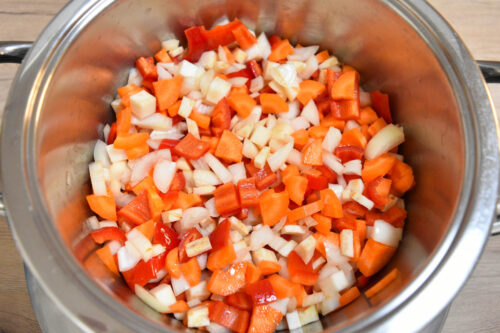 - In einen Topf das Öl, Zwiebeln, Möhren, Paprika und Sellerie geben und scharf anbraten.3 EL Olivenöl
