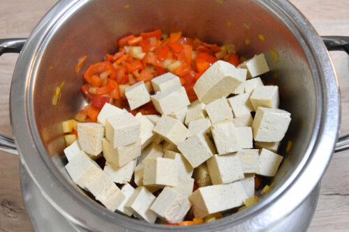 - Wenn die Zwiebeln beginnen, glasig zu werden die Tofu Würfel zugeben und kurz mitanbraten.