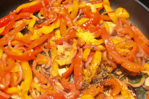 - In einer Pfanne die Paprika mit dem Olivenöl kurz anbraten. Die Zwiebelringe zugeben und weiter braten.