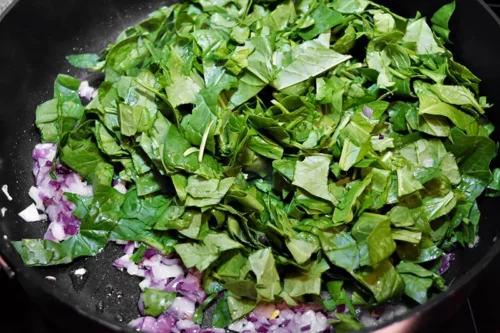 - In eine große Backofen feste Pfanne etwas Öl geben und die Zwiebelwürfel anbraten. Den Spinat zu der Zwiebel geben und mit braten.