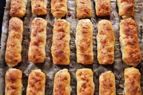 Für diese Röllchen benutze ich sehr gerne Filo- oder Yufka Teig. Filo Teig ist ein sehr dünner ungesäuerter Teig, der zur Herstellung von Gebäck wie Baklava und Börek (Burek) in der Küche des Nahen Ostens und des Balkans verwendet wird.