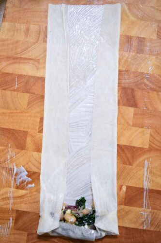 - Den Teig zuerst von unten nach oben über die Füllung schlagen. Dann die rechte Seite der Teigplatte auf ihrer gesamten Länge nach links schlagen und die linke Seite ebenso auf der gesamten Länge nach rechts schlagen. Abschließend das Röllchen von unten nach oben aufrollen und mit der Naht nach unten auf ein mit Backpapier ausgelegtes Backblech legen.