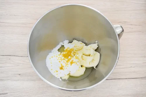 - Den Mascarpone in eine Rührschüssel geben, den Puderzucker durch ein Sieb einstreuen und den Zitronensaft sowie -abrieb hinzugeben. Alles zu einer homogenen Masse verrühren.250 g Mascarpone, 60 g Puderzucker, 2 Bio-Zitronen